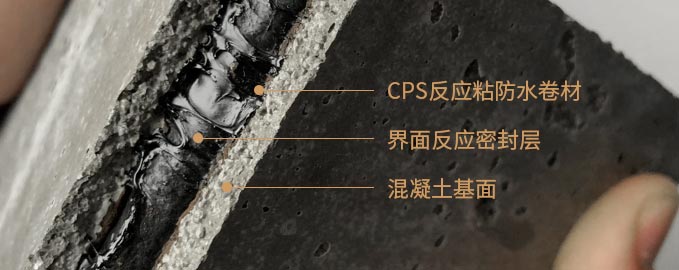 CPS反应粘卷材通过CPS粘结效应与混凝土基层牢固粘结,形成界面反应密封层,与混凝土基层融为一体。